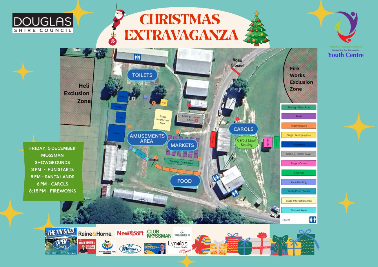 Mossman Support Services, Douglas Shire Council, and the Tin Shed are teaming up to bring you the Christmas Extravaganza—a joyful celebration for the whole community.