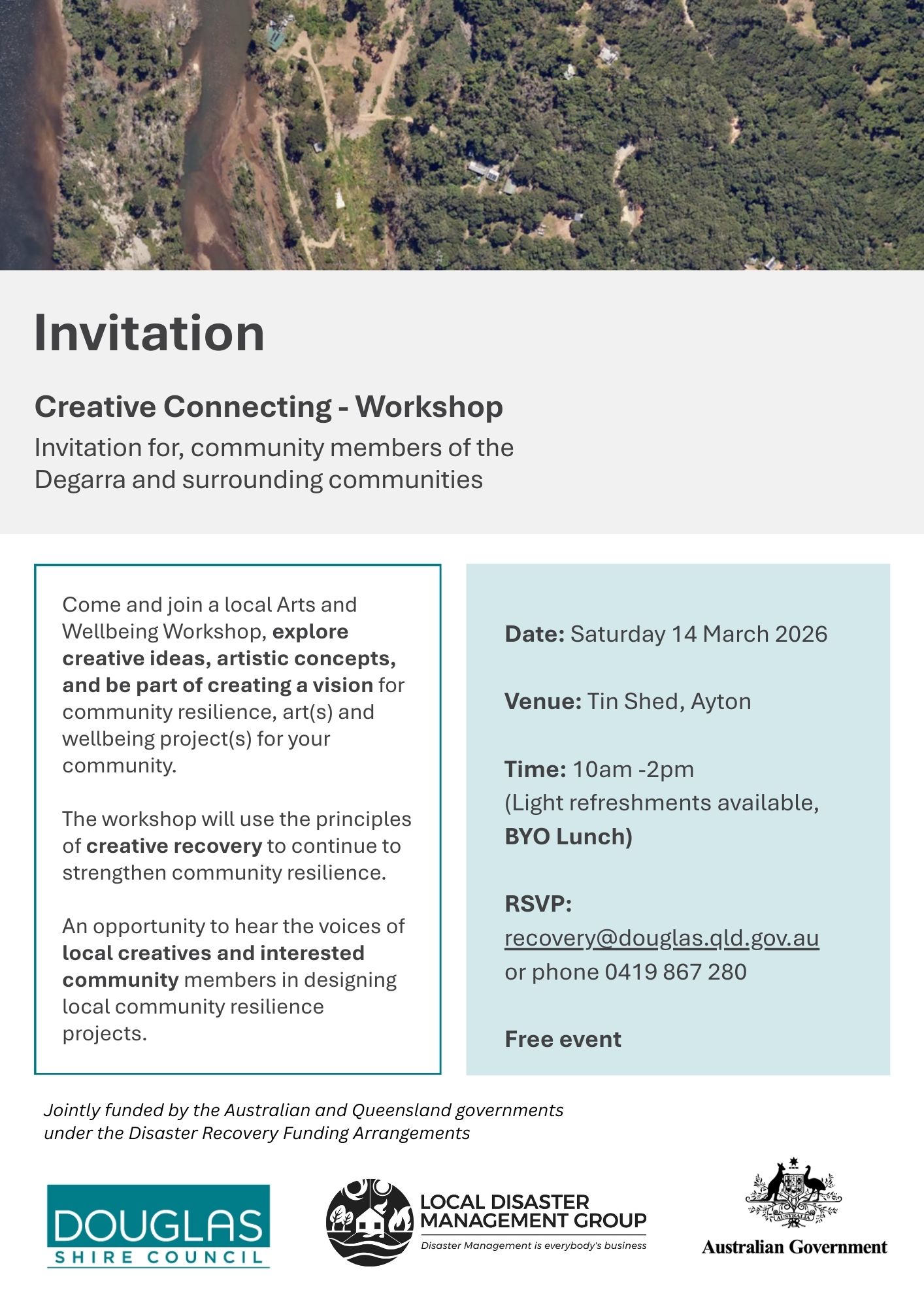 RSVP: recovery@douglas.qld.gov.au or phone 0419 867 280 (it would be great to know if you’re planning to come, but you’re also welcome to just pop in on the day).