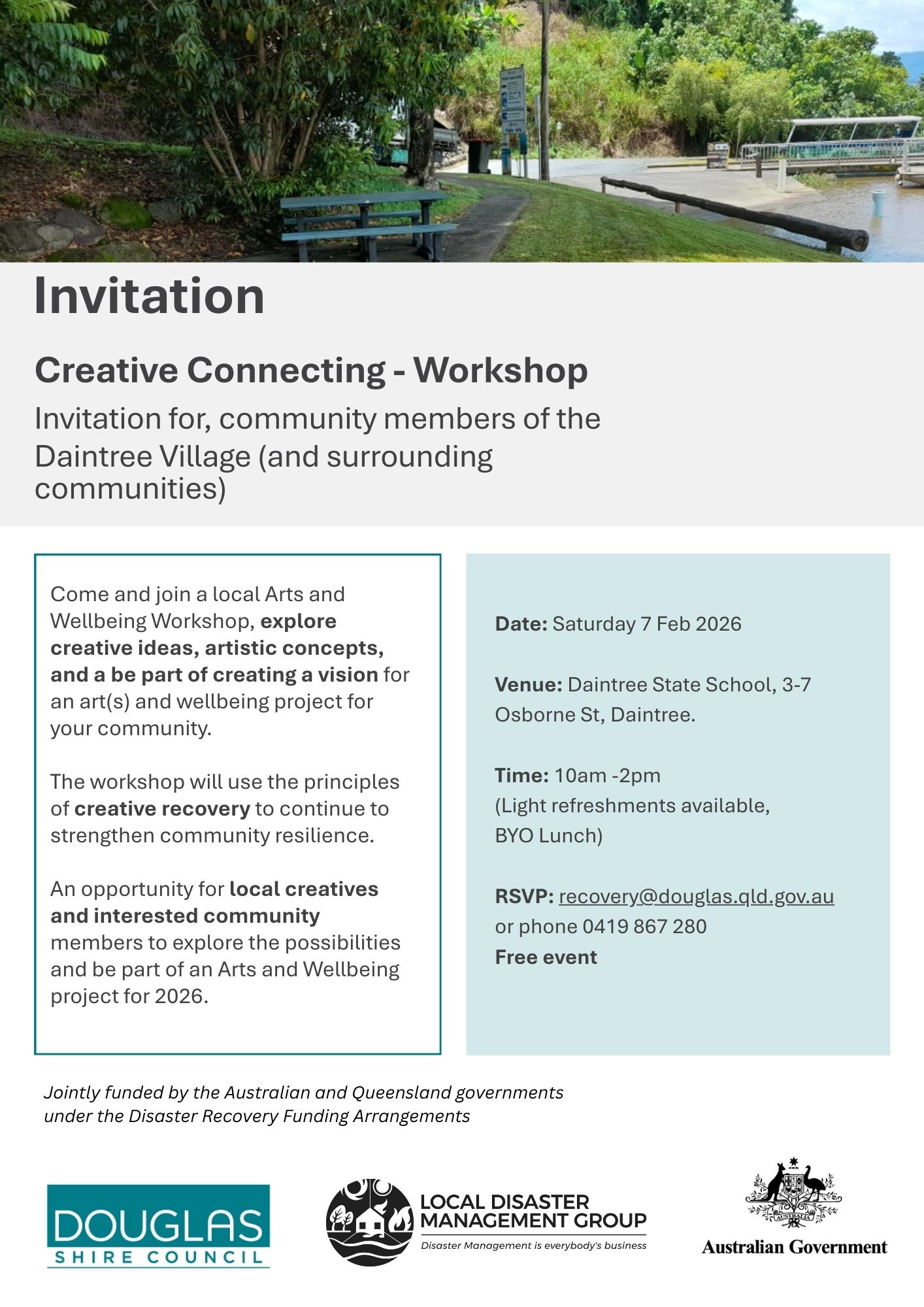 RSVP: recovery@douglas.qld.gov.au or phone 0419 867 280 (it would be great to know if you’re planning to come, but you’re also welcome to just pop in on the day).