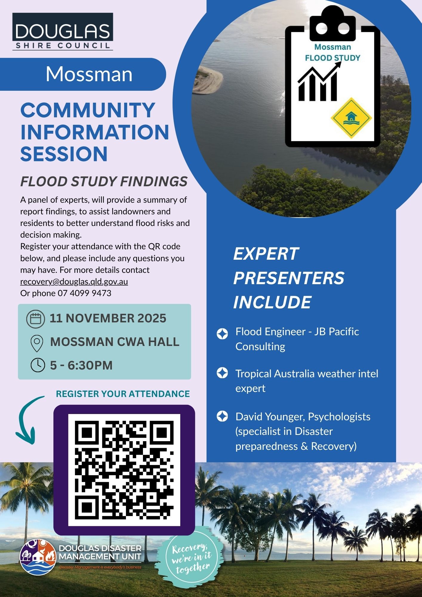 A panel of experts, will provide a summary of report findings, to assist landowners and residents to better understand flood risks and decision making for the Mossman Community.