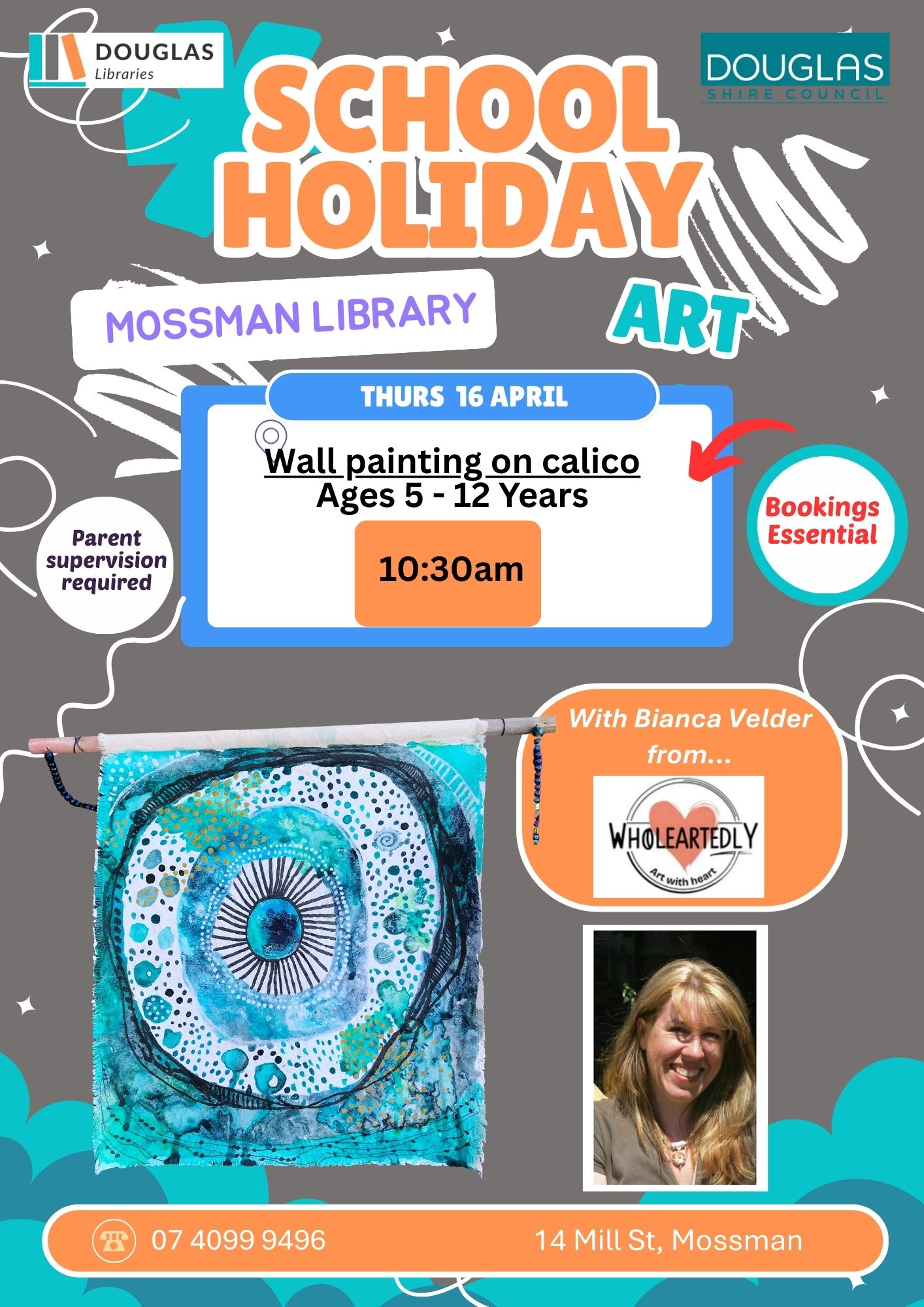 Join Mossman Library for a fun artistic morning of wall painting on calico with Bianca Velder from Wholeartedly.
