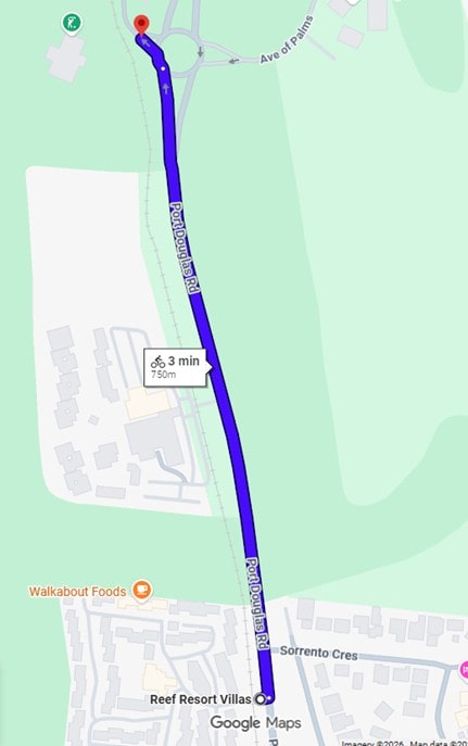 - 740 metres from Mirage Country Club to the entrance to Reef Resort Villas.