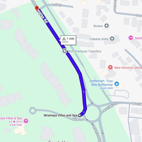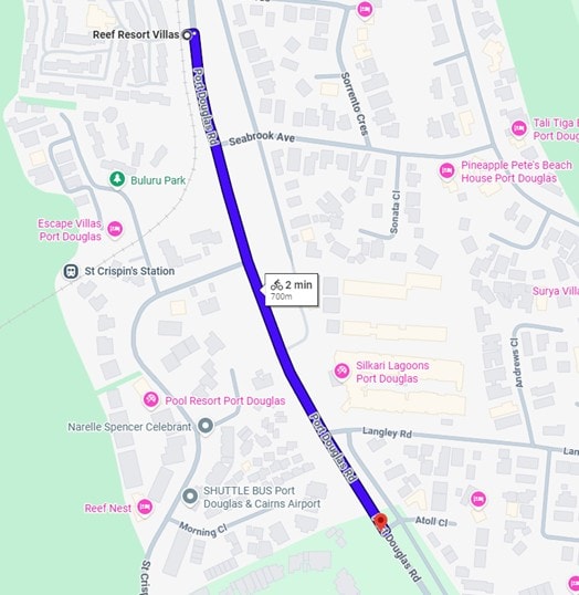 - 680 metres from Reef Resort Villas to opposite Atoll Close (the banana stand)
